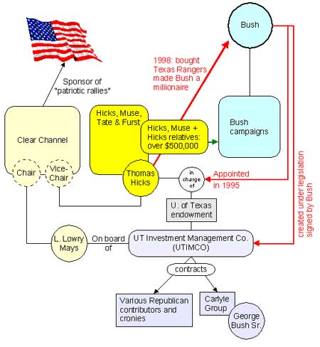 Here is a searchable Radio/TV etc Database on CLEAR CHANNEL. Use it as a tool, it may come in handy later should TBTM decide to go for it and boycott CLEAR CHANNEL - interested? Atrios Clear Channel Worldwide Inc., the nation’s largest owner of radio stations (over 1200 stations in all 50 states and DC), sponsored the numerous "patriotic rallies" which were held in various cities around the country. They organized, advertised, provided speakers and entertainment for them, and even handed out numerous American flags to participants. While Clear Channel promoted these as patriotic rallies, the attendees obviously felt otherwise. In addition to waving their provided flags, they also held signs condemning their fellow Americans - liberals, Hollywood, the Dixie Chicks. They were not so much patriotic rallies as pro-war rallies, and not so much pro-war rallies as rallies against anyone who opposes the Bush administration's policies. There are close ties between the company and President Bush. The Vice Chair of the company is Tom Hicks, a member of the Bush Pioneer club for elite (and generous) donors. The relationship between Bush and Hicks goes back even further, however. The two were embroiled in scandal when Hicks, as University of Texas Regent, was responsible for granting endowment management contracts of the newly created (under legislation signed by Bush) UT Investment Management Co. (UTIMCO). The contracts were given to firms politically connected to both Hicks and Bush, including the Carlyle Group - a firm which has the first President Bush on the payroll and had the second one on the payroll until just weeks before receiving this lucrative business. The board of UTIMCO also included the Chair of Clear Channel, L. Lowry Mays. In addition, Hicks purchased the Texas Rangers from George Bush, making him a wealthy man through a deal that was partially sweetened by a shiny new taxpayer financed stadium, which included valuable land obtained at below market rates through the use of eminent domain. Whether or not the close ties between the radio