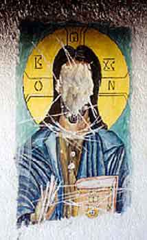 website pulls up scores of links on the related subjects. Sometimes the troops of the KLA would leave a crude graffito signifying their presence, such as "UCK" (the Albanian equivalent of "KLA") scrawled across an icon. (See photo included in the report, Destruction of Christian churches and monasteries in Kosovo and Metohija since arrival of NATO, complied by the Berkley Kolo of Serbian-American Sisters.)