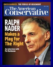 So, Nader's being paraded before the readership of the American Conservative as a possible option to Bush and Kerry (an absurdity on the face of it), despite his known support for Roe vs. Wade and sodomite 'rights.' (Why is it Nader who's being interviewed and not men such as Ron Paul or Michael Peroutka, either of who is much closer to the ideals Pat professes to believe?) And Buchanan doesn't even challenge him on these stands, opting, instead, to let Nader express his unchristian views unmolested, then move on without fanfare to another subject.