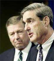 "Two of the seven suspected terrorists linked by the Bush administration to an impending "hard" attack on the United States are probably not even in North America, said officials Wednesday.  After naming the seven suspects – including two Canadians – at a prime-time news conference, top U.S. officials including FBI Director Robert S. Mueller III and Attorney General John Ashcroft (photo, right, Mueller in foreground) said none of them is likely to be in the United States."