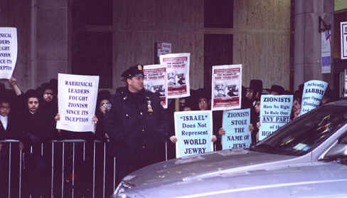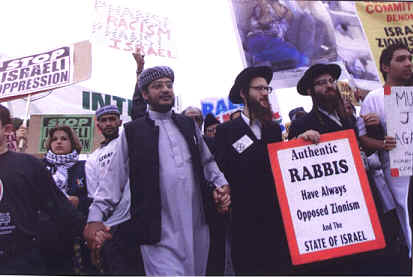 Above: Rabbi Moshe Hirsch of Neturei Karta - Jerusalem, in one of his recent meetings with PLO chairman Arafat in Ramallah, publicizing the fact that Orthodox Jews oppose "Israeli" occupation and conflict with the Palestinians and on the contrary would prefer to live under Palestinian rather than Zionist rule, Rabbi Hirsch has been appointed Minister of Jewish affairs by Chairman Arafat in a future Palestinian state. Below: Rabbis from Neturei Karta and other Orthodox Jewish groups protest against Zionism and "Israeli" occupation. Rabb R R