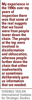 And David Albright, a former analyst and inspector who monitored Iraq's nuclear program from 1992 to 1997. He's now president of the Institute for Science and International Security in Washington. Well, given how long the United States has been in control of most of the territory in Iraq, is the search about where you expected it to be, Terence Taylor? TERENCE TAYLOR: I think it is. I'm not surprised that the coalition forces haven't yet discovered any substantial amounts or evidence of weapons of mass destruction programs. This was weapons programs that were hidden not just from inspectors, but from most of the Iraqi people as well, and very deeply embedded. And only a very few people knew about the whole of the programs, it was very compartmentalized. I think the key to all of this, in discovering what the real truth is, is individuals coming forward, not just the top scientists, these are important of course, but I think people further down the chain of command will actually reveal a bit more. We have to remember, too, the coalition don't have all the people in place on the ground, the scientists, those with the corporate memory, not just military people, I mean, people, former U.N. Special Commission inspectors and so on, people who have the corporate memory in the background and know the people involved with the programs, and they're not in place yet in Iraq. RAY SUAREZ: David Albright, same question.
