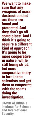 And I think that's right, that has to be done, and you have to remember it's only two or three days ago that the president announced that the major armed conflict has come to an end, so it's only now that you can start putting into the country these teams that David Albright is talking about, including scientists and those with deep knowledge of the programs in the past, know the people involved. And that process hasn't started, and I think that's the time when we'll find some new information. Also, those that need to come forward need to have confidence that there is going to be some stability for some short period of time at least, maybe a transitional government in place, to give them confidence to come forward and give the information, and certainly that situation doesn't exist at the moment. I'm sure that's stopping some people from coming forward. |