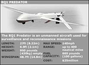 But the war against al-Qaeda and the Taleban led to drones being specially adapted to carry weapons - notably Hellfire anti-armour missiles. Reports from Afghanistan said that drones had been able to locate key al-Qaeda or Taleban leaders, but ground or air attack units had then been unable to follow up with successful combat missions. Henceforth the capability to attack targets was identified as a valuable addition to the drone's usefulness. The adapted drones were used in Afghanistan and now in Iraq and, it is presumed, in the attack against al-Qaeda suspects in Yemen. Widely used intelligence tool The United States is far from being the only country to use drones. Israel is a major producer and user of military drones, using them for reconnaissance of its borders and to gather military intelligence about its Arab neighbours' military capabilities. In June, Pakistan shot down a drone being used by the Indian military along their border. It is believed that Israel had sold India Hunter and Searcher drones in the late 1990s. Those UAVs are like very large model aircraft and carry cameras and sensors rather than weapons. Two years ago, the Iraqi news agency reported that the country's air defences had shot down an Iranian drone which had intruded into its air space. Key weapon against Iraq The US used drones in the Balkans in 1999 and lost at least one of them due either to hostile fire or control problems resulting from a build up of ice on their wings.